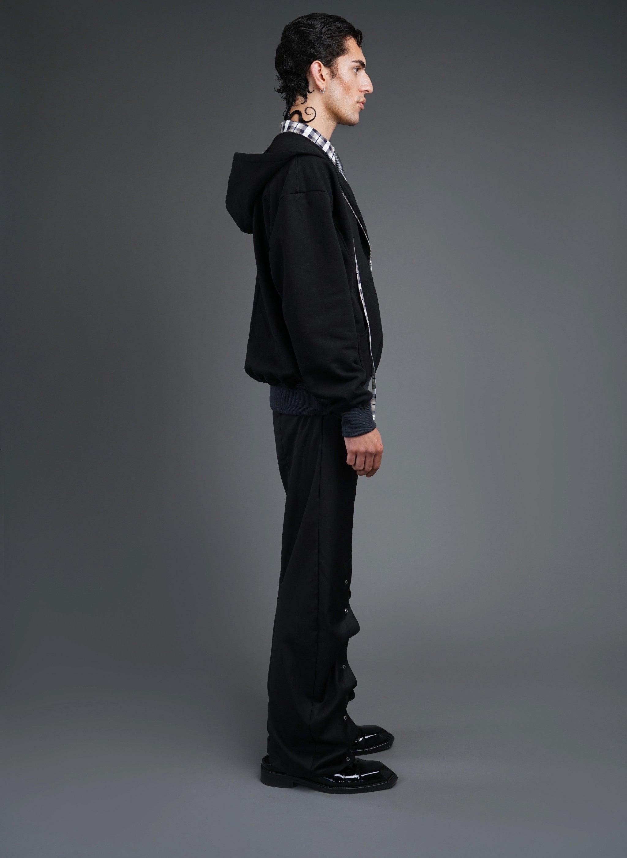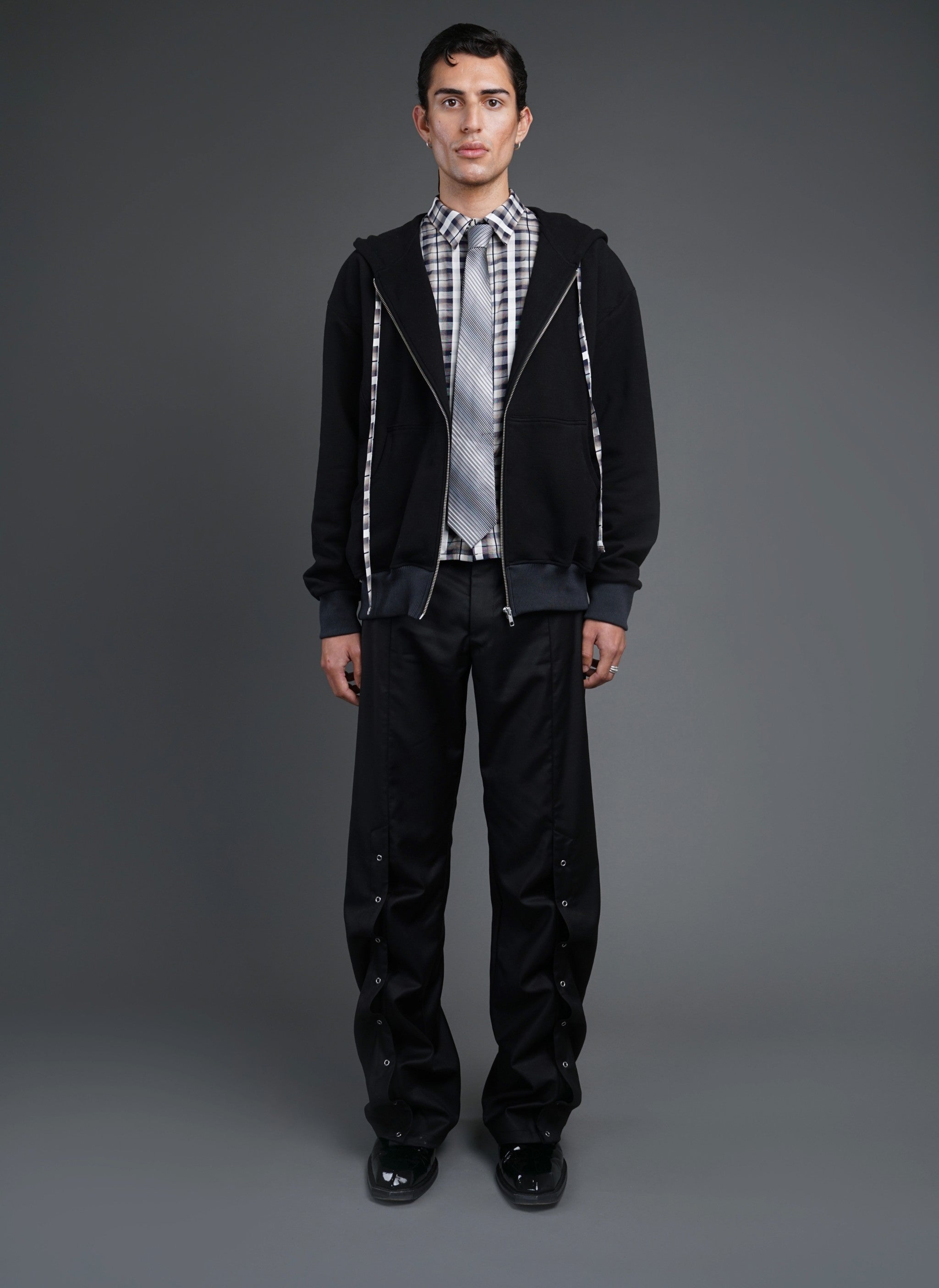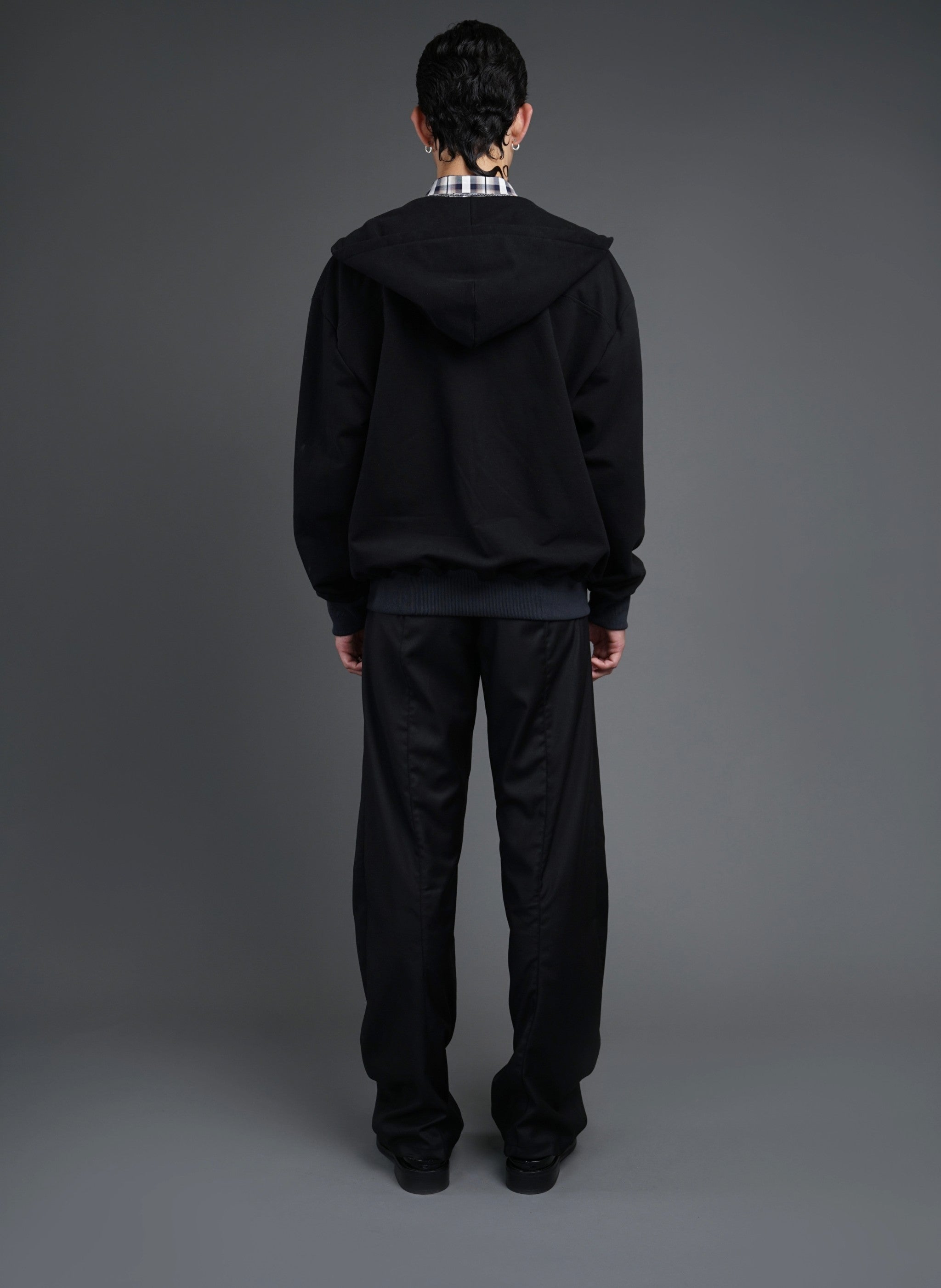 The second release by Willem Worldwide and SSCHAFER is the Employee of the Month Hoodie. This Hoodie is made in a Cotton Elastane Fleece, and features a in-built shirt that can be buttoned up, or left undone for a more relaxed look. Featuring a zip-up front, this hoodie is designed to be a slouchy fit, with ribbed cuffs and hem to give it more structure. The in-built shirt is made in a Cotton/Silk blend plaid, and features a placket button-up front with a tailored collar.