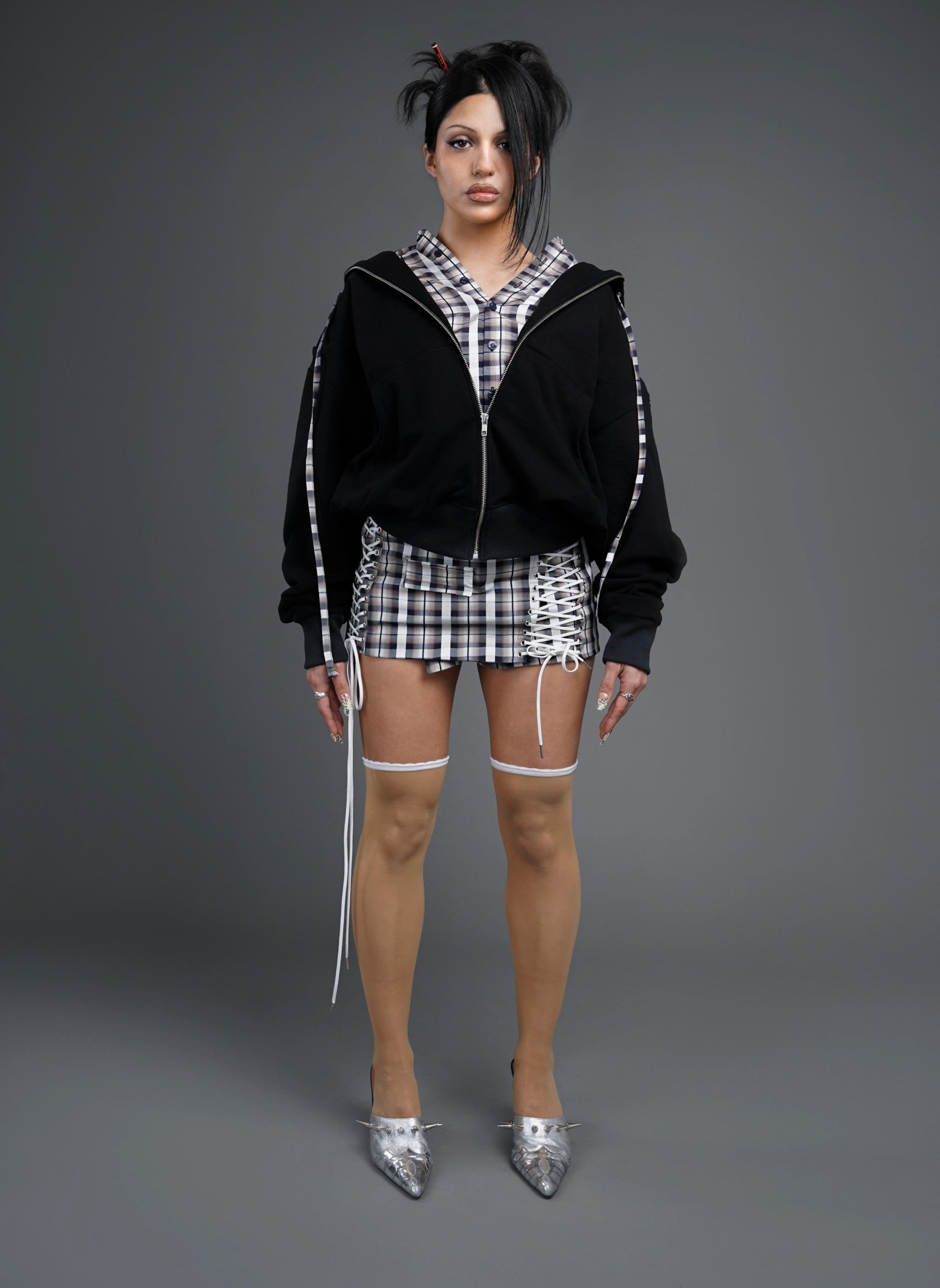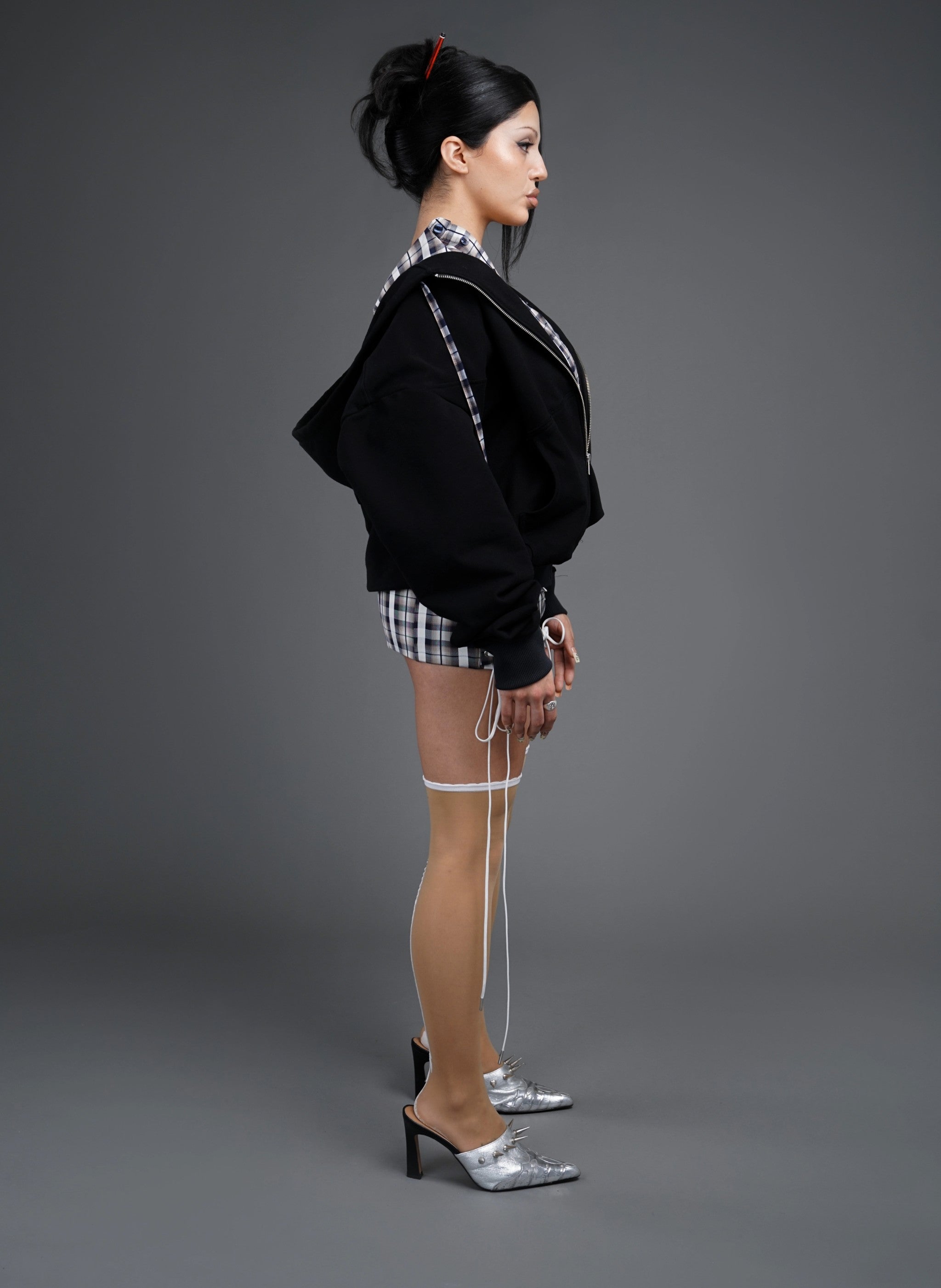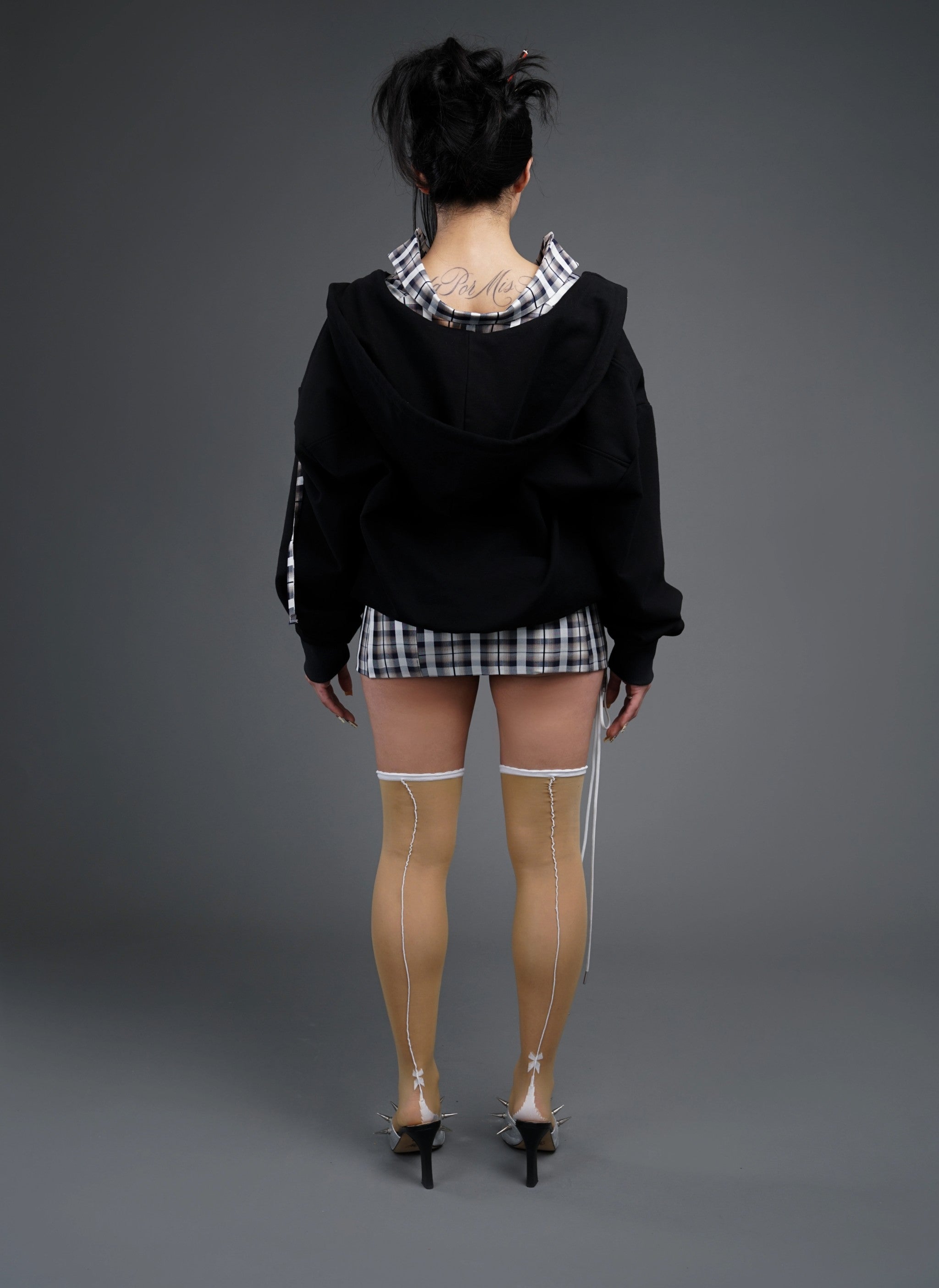 The second release by Willem Worldwide and SSCHAFER is the Employee of the Month Hoodie. This Hoodie is made in a Cotton Elastane Fleece, and features a in-built shirt that can be buttoned up, or left undone for a more relaxed look. Featuring a zip-up front, this hoodie is designed to be a slouchy fit, with ribbed cuffs and hem to give it more structure. The in-built shirt is made in a Cotton/Silk blend plaid, and features a placket button-up front with a tailored collar.